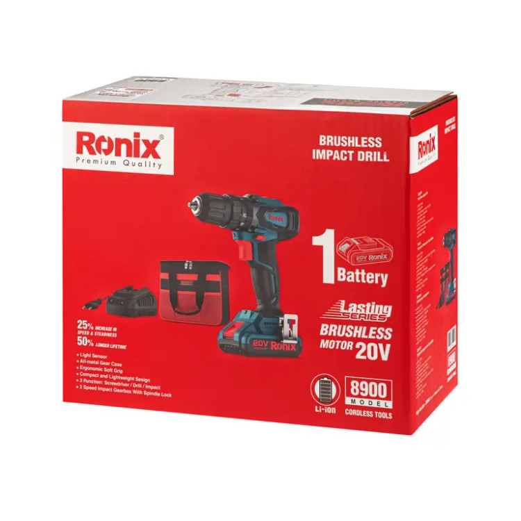 دریل پیچ گوشتی چکشی شارژی براشلس 20 ولت تک باطری مدل 8900 رونیکس