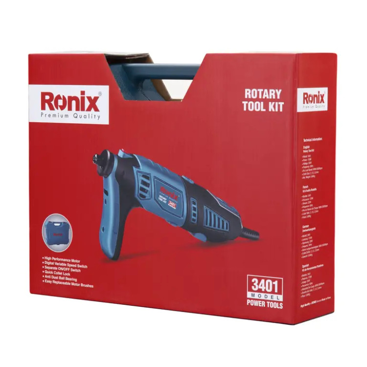 فرز مینیاتوری 3401 رونیکس، به یک موتور قدرتمند 170 وات مجهز است. این دستگاه، از سیستم تغییر دور دیجیتال و بورد الکتریکی مقاوم بهره میبرد. سرعت موتور با کلیدهای مثبت و منفی دیمر در محدوده 8000 تا 35000 دور در دقیقه تنظیم میشود. طراحی ابزار ارگونومیک بوده و با برخورداری از دسته جانبی، قدرت مانور بالاتری را به شما میبخشد تا به صورت ثابت نیز بتوانید از آن در مصارف بلندمدت استفاده کنید. ابتدا و انتهای 3401 با روکش سیلیکونی پوشانده شده است.