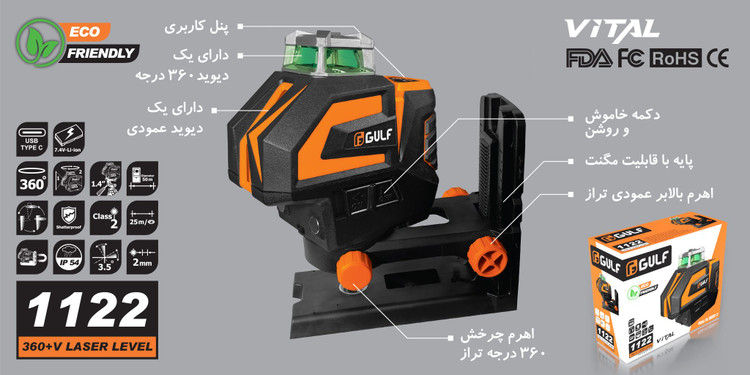 از همین جهت تنها در صورتی اقدام به خرید این محصول کنید که نیاز ضروری به لیزر سبز داشته باشید؛ در غیر این صورت محصول مشابه همین مدل گالف که لیزر قرمز دارد، گزینه بهصرفهتری برای شماست. همچنین باید به این نکته مهم اشاره کنیم که تراز لیزری 4 خط لیزر سبز گالف مدل 1122 پوشش 360 دارد: اگر در شغل خود نیاز دارید چندین فضای مختلف را با یکدیگر تراز کنید، بدون شک لیزرهای 180 درجه به کار شما نخواهند آمد و به محصولاتی حرفهایتر نظیر این تراز لیزری احتیاج خواهید داشت. با ما همراه باشید.