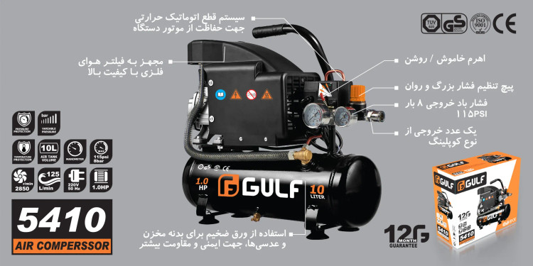 - بهرهگیری کمپرسور باد 10 لیتری گالف مدل 5410 از کلید اهرمی اتومات طرح آلمان FBANG از دیگر امکانات فوقالعاده آن است.