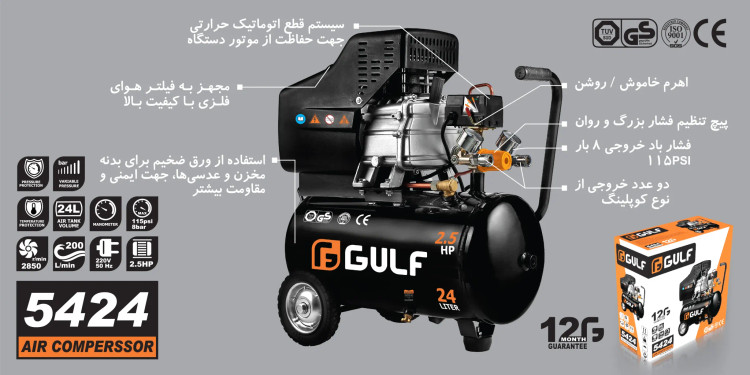 - بهرهگیری کمپرسور باد 24 لیتری گالف مدل 5424 از کلید اهرمی اتومات طرح آلمان FBANG از دیگر امکانات فوقالعاده آن است.