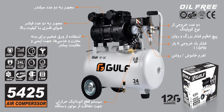 کمپرسور سایلنت 24 لیتری تک موتور 2 اسب مدل 5425 گالف