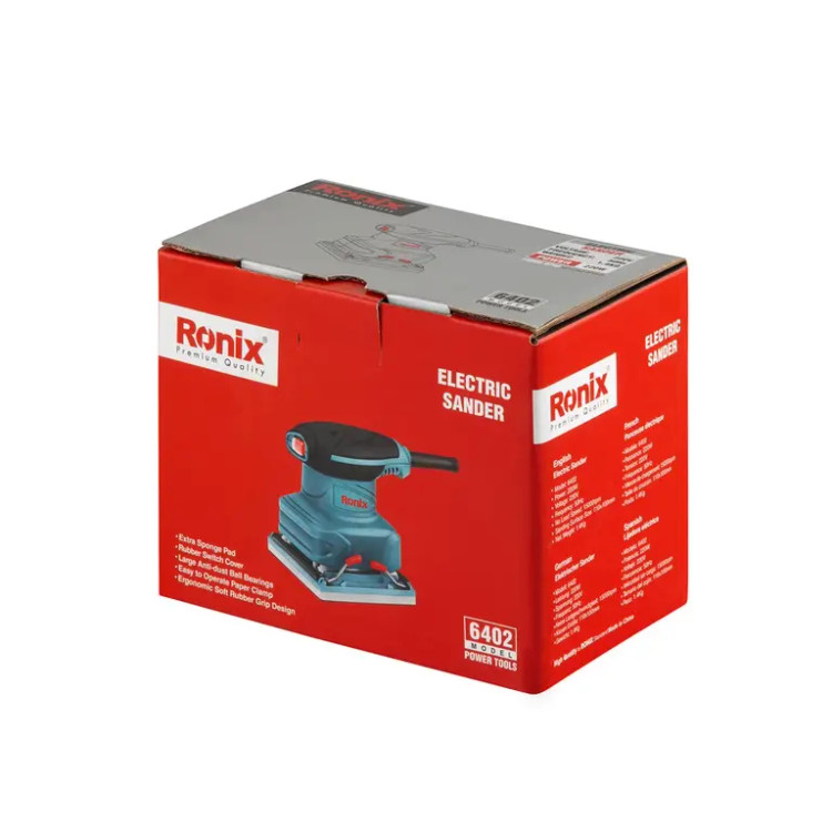 سنباده لرزان 6402 رونیکس، دارای موتوری پرقدرت با دور بالا و توان 220 وات است که قابلیت 15000 لرزش در دقیقه را برای دستگاه فراهم میکند. ازآنجاییکه از این دستگاه در کارگاههای نجاری استفاده میشود، در طراحی آن از بلبرینگها و کلید ضد غبار استفاده شده تا با جلوگیری از ورود گرد و غبار و تراشههای چوب به داخل دستگاه، موجب افزایش طول عمر آن شود.